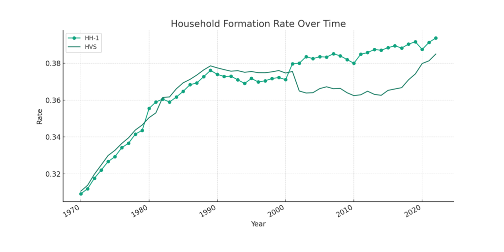 I need to spend some time to understand the difference between the surveys, specifically why the ASEC HH-1 data does not reflect the increase in household formation over the last decade. Clearly the increased rate of household formation, with a higher percentage of the population seeking an independent housing unit has been a large driver of housing demand and the resulting housing shortage.